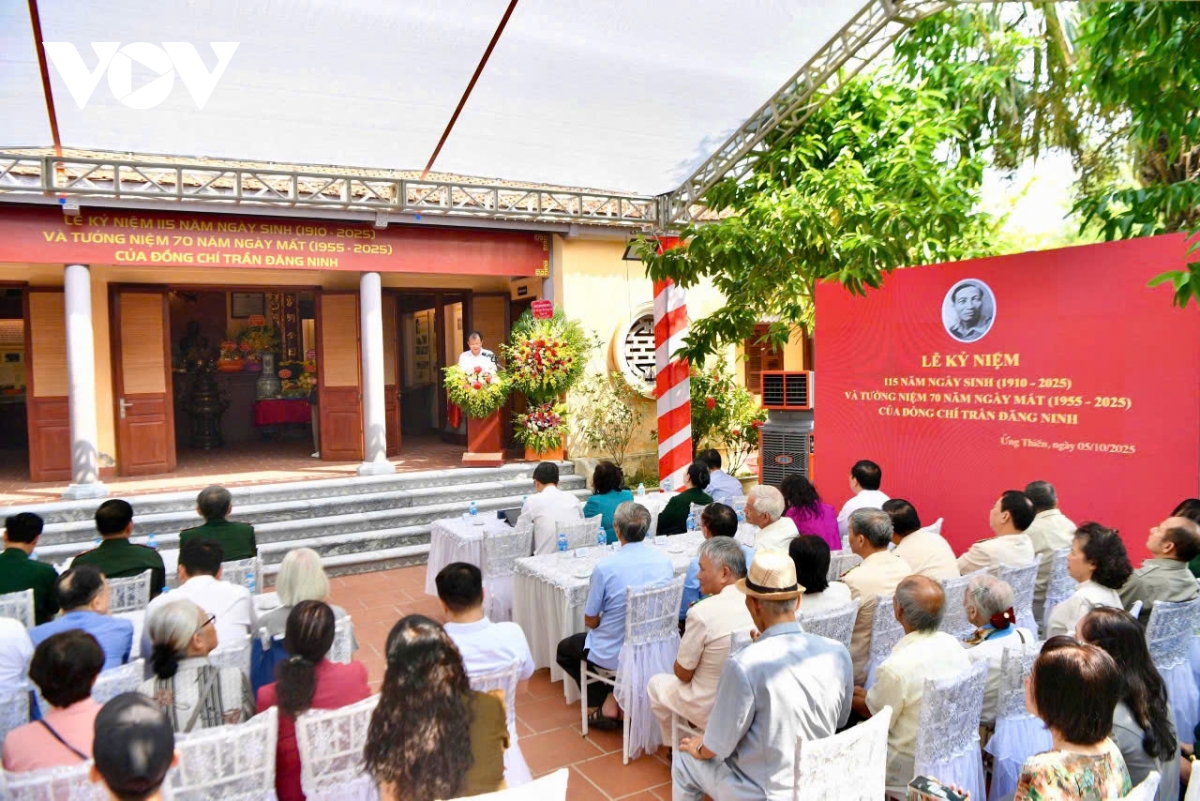 VOV.VN - Ngày 5/10, tại khu tưởng niệm Trần Đăng Ninh (thôn Quảng Nguyên, xã Ứng Thiên, TP Hà Nội), Đảng ủy, HĐND, UBND, Ủy ban MTTQ Việt Nam xã Ứng Thiên phối hợp tổ chức trọng thể Lễ kỷ niệm 115 năm ngày sinh (1910 - 2025) và tưởng niệm 70 năm ngày mất (6/10/1955 - 6/10/2025) đồng chí Trần Đăng Ninh.