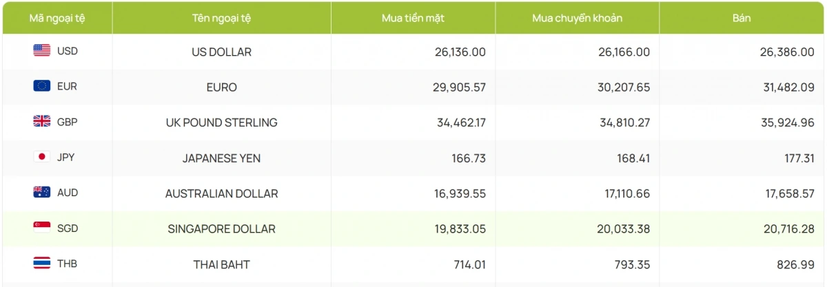 Ngân hàng Vietcombank chiều tối nay giữ nguyên mức công bố phiên sáng, niêm yết tại 26.136 - 26.386 đồng/USD (mua vào và bán ra).