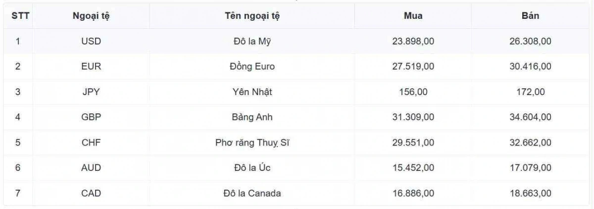 Tỷ giá các ngoại tệ mạnh khác trong giỏ thanh toán quốc tế, tại Ngân hàng Vietcombank được niêm yết như sau: