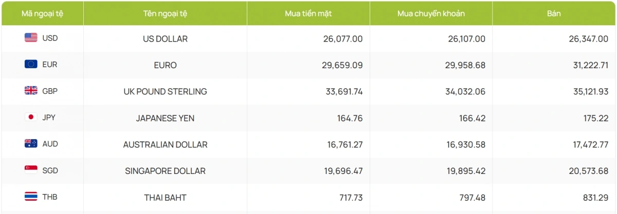 Ngân hàng Vietcombank niêm yết tại 26.077 - 26.347 đồng/USD (mua vào và bán ra), hạ xuống thấp hơn phiên trước đó 30 đồng chiều mua và không đổi chiều bán.