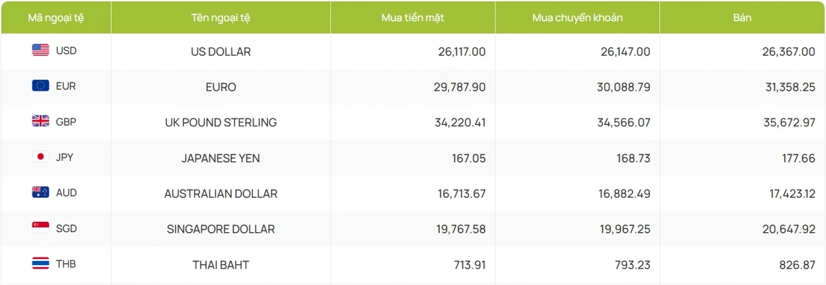 Ngân hàng Vietcombank hiện niêm yết tại 26.117 - 26.367 đồng/USD (mua vào và bán ra), tăng 20 đồng chiều mua và giữ nguyên giá bán so với phiên trước.