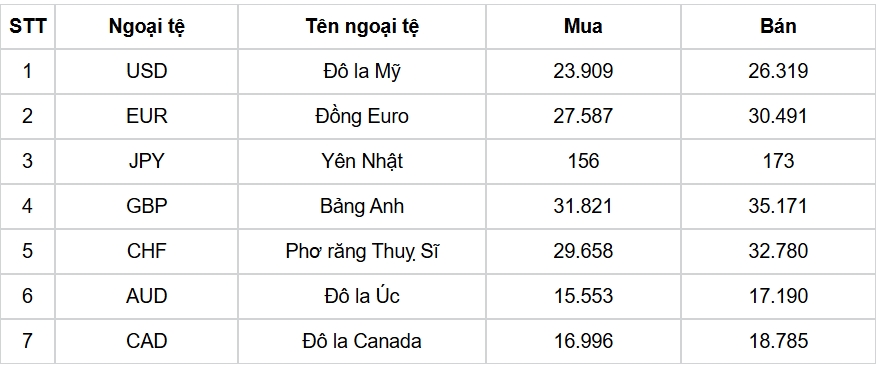 Tỷ giá các ngoại tệ mạnh khác trong giỏ thanh toán quốc tế, tại Ngân hàng Vietcombank được niêm yết như sau: