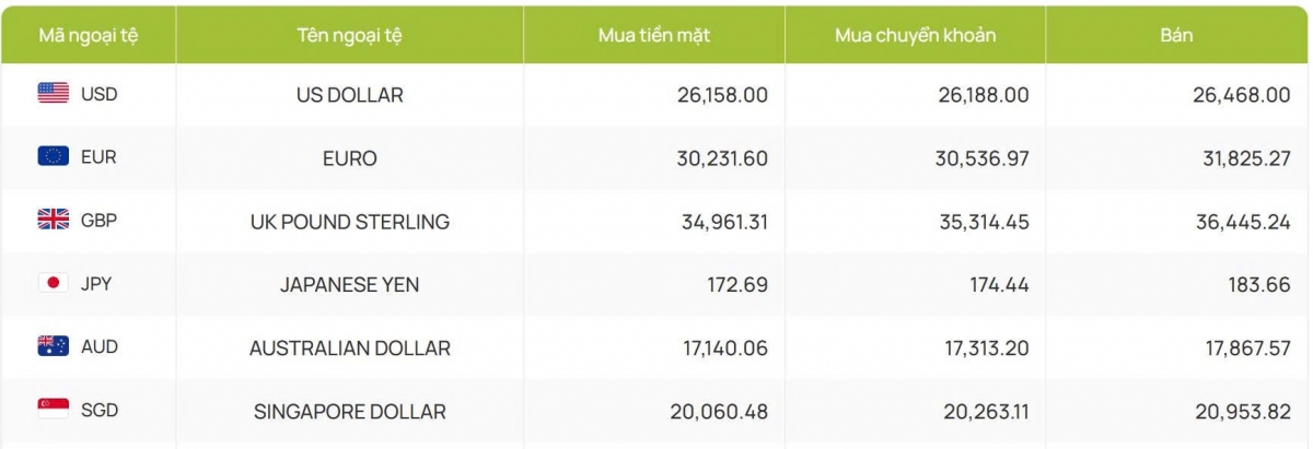 Tỷ giá cập nhật trong phiên làm việc đầu tiên ngày thứ Năm, Ngân hàng Nhà nước công bố tỷ giá trung tâm là 25.177 đồng/USD, giảm 10 đồng so với thứ Tư. Một số ngân hàng thương mại lớn cũng đa số giao dịch ở mức bằng hoặc thấp hơn phiên trước, mức cao nhất được ghi nhận là 26.446 đồng/USD. Chỉ số USD Index (DXY) đạt 97,76 điểm.