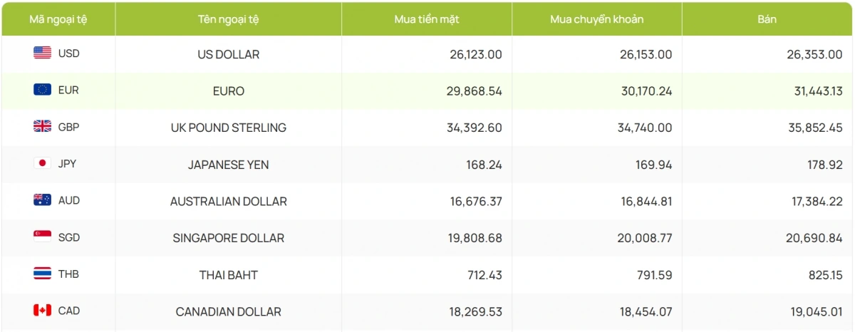 Cụ thể, ngân hàng Vietcombank công bố giao dịch ở mốc 26.123 - 26.353 đồng/USD (mua vào và bán ra), giữ nguyên từ phiên liền trước.