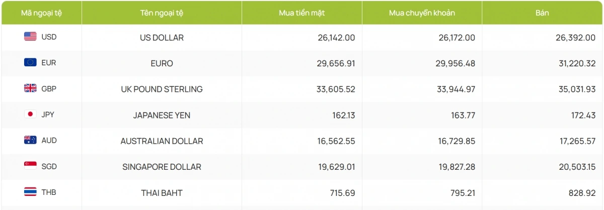 Ngân hàng Vietcombank giữ bằng phiên trước, niêm yết tại 26.142 - 26.392 đồng/USD (mua vào và bán ra).