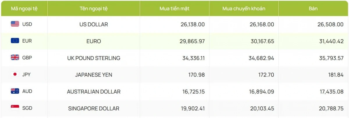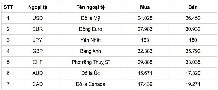 Tỷ giá các ngoại tệ mạnh khác trong giỏ thanh toán quốc tế, tại Ngân hàng Vietcombank được niêm yết như sau: