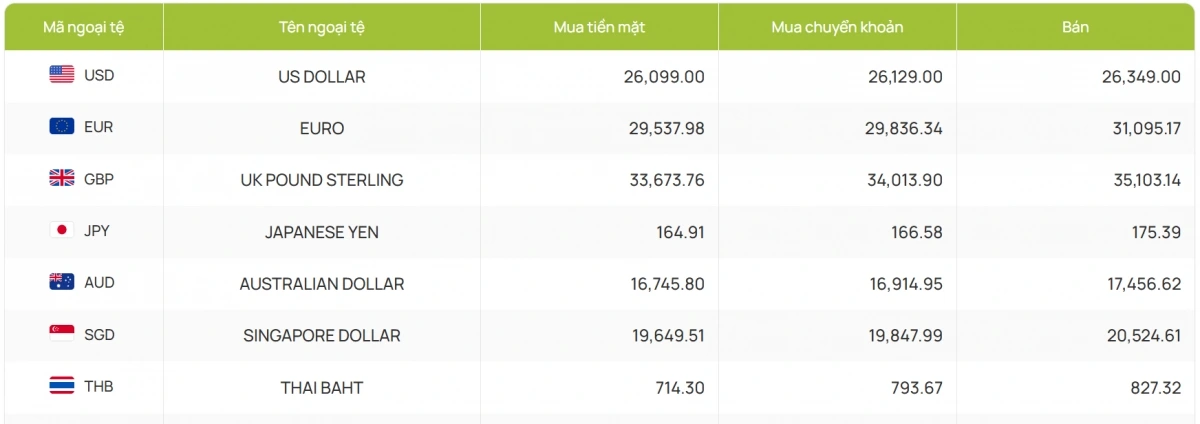 Ngân hàng Vietcombank niêm yết tại 26.099 - 26.349 đồng/USD (mua vào và bán ra), chiều mua đã tăng 20 đồng còn giá bán giữ nguyên so với phiên mở của cùng ngày.