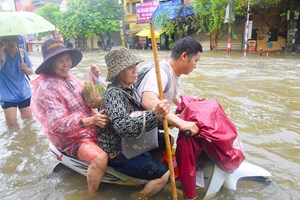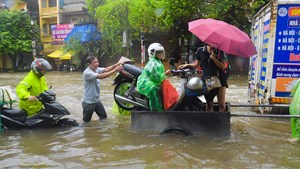 Xe chết máy, nam thanh niên vẫn tình nguyện dắt xe đưa 2 cụ già qua "biển nước"