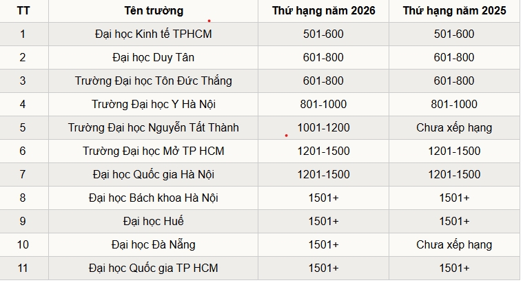 Đáng chú ý, Đại học Nguyễn Tất Thành và Đại học Đà Nẵng lần đầu góp mặt trong bảng xếp hạng, lần lượt ở nhóm 1001–1200 và 1501+. Các trường còn lại của Việt Nam đều duy trì vị trí như năm 2025.