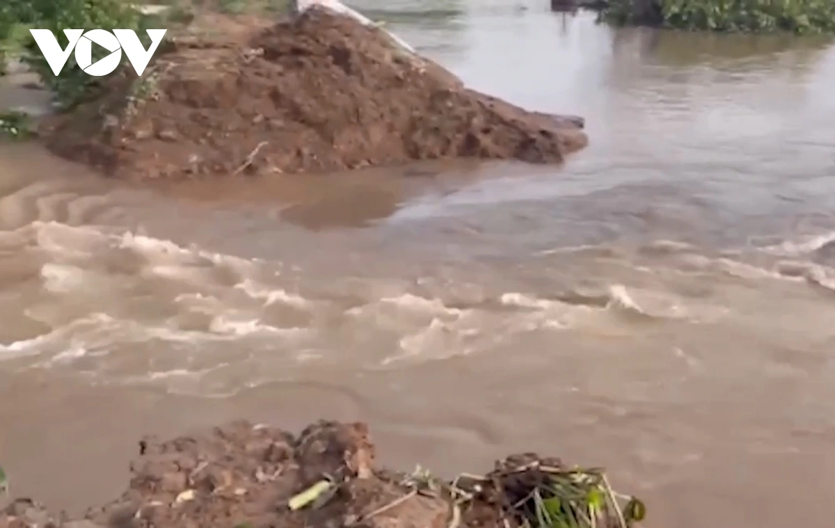 VOV.VN - UBND tỉnh Vĩnh Long vừa công bố tình huống khẩn cấp sạt lở đê bao cồn Thanh Long, xã Quới Thiện sau khi triều cường làm vỡ một đoạn đê dài 15m, gây ngập hơn 15ha đất vườn. Chính quyền địa phương đang khẩn trương triển khai biện pháp ứng phó, gia cố khu vực sạt lở, đảm bảo an toàn cho người dân.