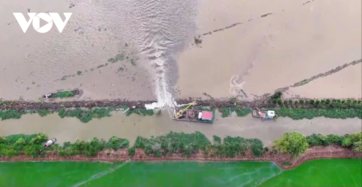 Nhận được tin báo, Ban Chỉ huy Phòng thủ dân sự xã Phương Thịnh đã khẩn trương huy động lực lượng công an, quân sự cùng người dân khu vực trạm bơm với số lượng trên 70 người và điều động 2 chiếc kobe đến hiện trường, phối hợp với lực lượng tại chỗ tiến hành gia cố đoạn đê bị vỡ. Tuy nhiên, do mực nước chênh lệch giữa mặt ruộng và bên ngoài đê cao khoảng 2,5m, áp lực nước lớn, sau hơn 7 giờ khắc phục, việc gia cố đoạn bị vỡ không khắc phục được.