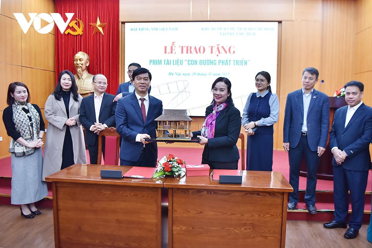 VOV.VN - Sáng 20/11, Đài Tiếng nói Việt Nam (VOV) đã trao tặng bộ phim tài liệu “Con đường phát triển” cho đại diện Khu di tích Chủ tịch Hồ Chí Minh tại Phủ Chủ tịch. Bộ phim là cầu nối văn hóa, lịch sử giúp cho công chúng, đặc biệt là thế hệ trẻ hiểu sâu hơn về tư tưởng, đạo đức, phong cách Hồ Chí Minh.