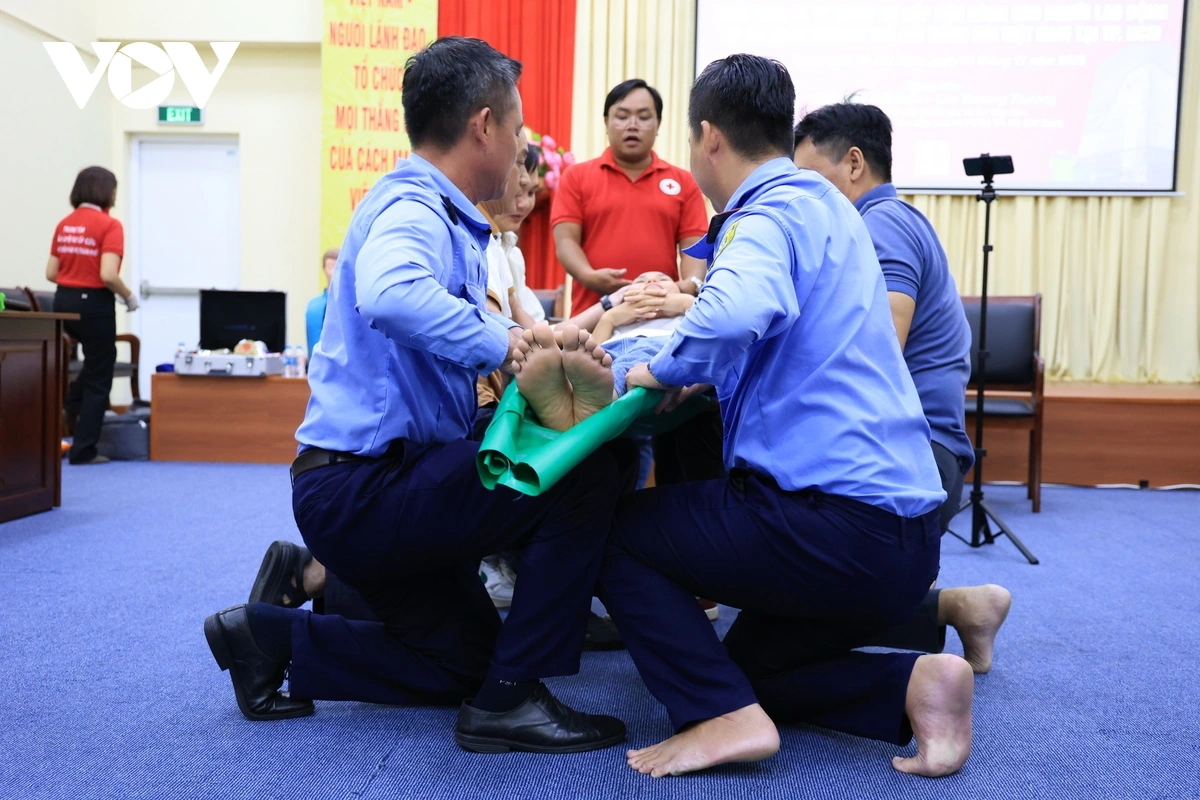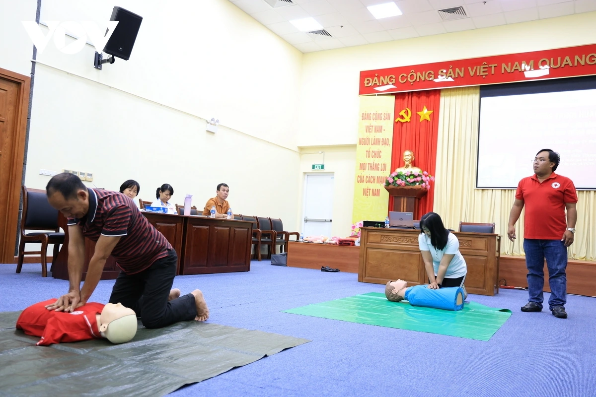 VOV.VN - Cơ quan thường trú Đài Tiếng nói Việt Nam tại TP.HCM phối hợp Trung tâm Huấn luyện Sơ cấp cứu và Phòng chống thảm họa TP.HCM tổ chức chương trình huấn luyện kiến thức và kỹ năng sơ cấp cứu dành cho người lao động.