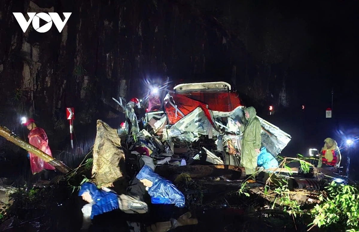 VOV.VN - Đêm qua (16/11), một xe khách 40 chỗ chạy tuyến Đà Lạt - Quảng Ngãi bị đất đá vùi trúng tại Km45 Quốc lộ 27C, đoạn qua đèo Khánh Lê (Khánh Hòa), khiến 5 người tử vong tại chỗ và nhiều hành khách mắc kẹt.