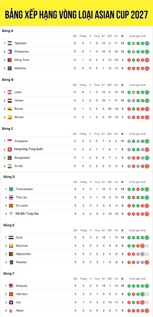 Bảng xếp hạng vòng loại Asian Cup 2027 mới nhất: ĐT Việt Nam chịu áp lực lớn