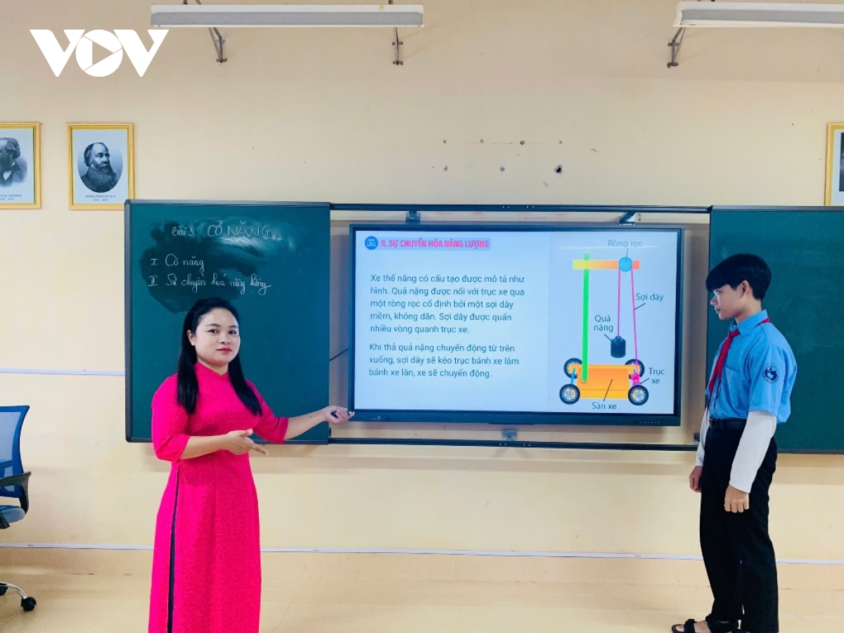 Cô giáo Trần Thị Thuỳ Dương, trường THCS Trần Hưng Đạo giảng bài cho học sinh có sử dụng màn hình LED