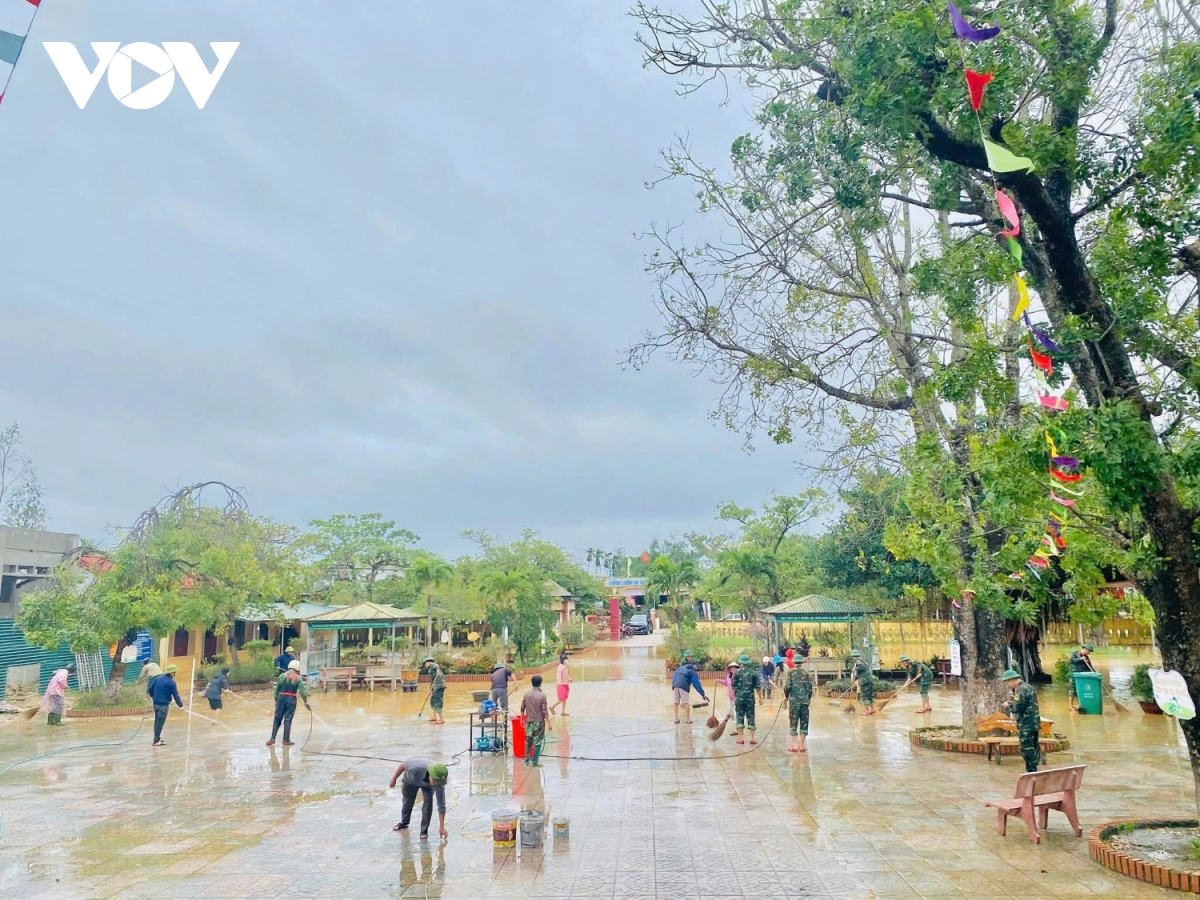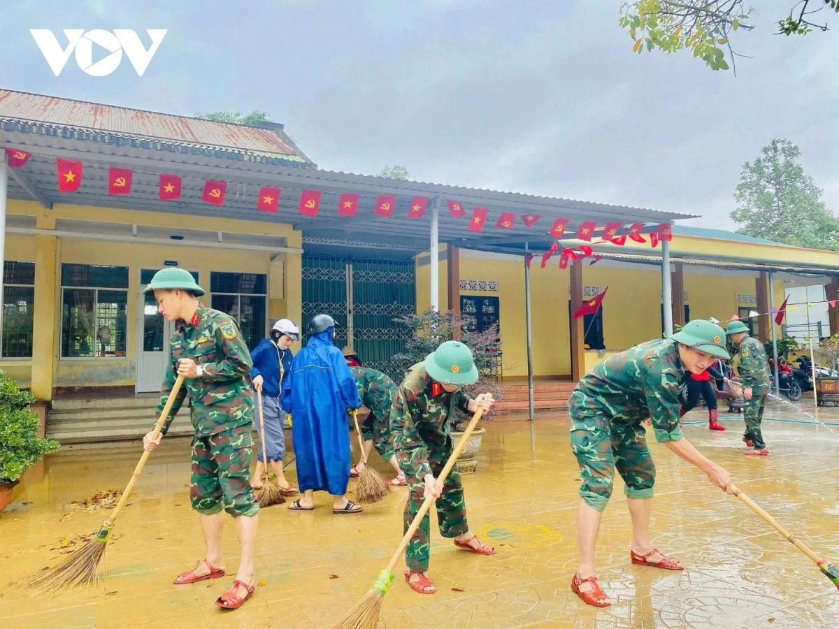 Với phương châm “nước rút đến đâu, giúp dân đến đó”, Bộ Chỉ huy Quân sự tỉnh Quảng Trị, Công an tỉnh Quảng Trị cùng các đoàn thể huy động tối đa nhân lực, phương tiện hỗ trợ người dân dọn lũ. Trong đó, ưu tiên hỗ trợ dọn dẹp các bệnh viện, trường học, gia đình chính sách và những nhà có người yếu thế, giúp sớm ổn định cuộc sống người dân. Đại tá Trịnh Thanh Bình, Chỉ huy trưởng Ban Chỉ huy Bộ đội Biên phòng tỉnh Quảng Trị đã chỉ đạo lực lượng biên phòng về cơ sở hỗ trợ tổng vệ sinh, khơi thông cống rãnh, dọn dẹp bùn đất ở nhiều khu dân cư. “Quan điểm lũ rút đến đâu khắc phục đến đó, chúng tôi tổ chức tập trung lực lượng khắc phục hậu quả, đặc biệt là các trụ sở, công sở và các trường học”.