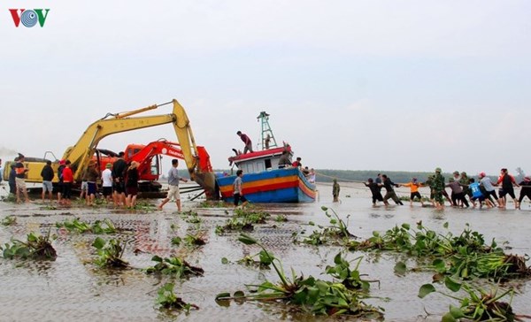 VOVVN - VOV.VN - Máy móc cùng hàng trăm người được huy động trong 2 ngày qua để giải cứu con tàu bị chìm rồi mắc cạn trên bãi cát.