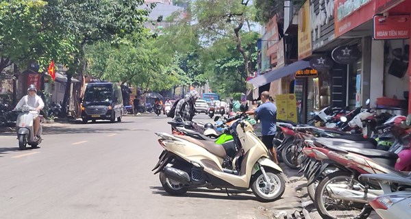 VOVVN - VOV.VN - Tình trạng lấn chiếm vỉa hè, ngang nhiên biến lòng đường thành bãi để xe trước cửa nhiều quán ăn trên đường Thái Thịnh, phường Trung Liệt, quận Đống Đa, Hà Nội trong...
