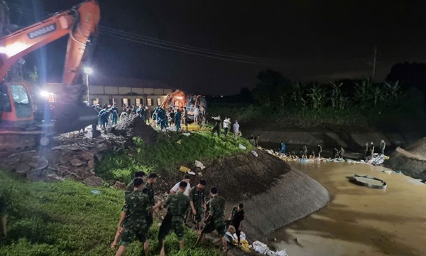 VOVVN - VOV.VN - Chính quyền địa phương đã huy động nhiều lực lượng xuyên đêm khắc phục sự cố xuất hiện mạch đùn, mạch sủi khu vực bể hút Trạm bơm Cẩm Bào, xã Xuân Cẩm,...