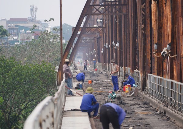 VOVVN - VOV.VN - Cầu Long Biên (Hà Nội) đang trong giai đoạn sửa chữa đột xuất kéo dài 2 tháng, tạm dừng toàn bộ phương tiện lưu thông để đại tu các hạng mục gồm cào...