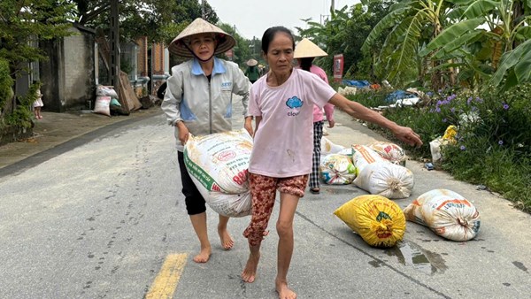 VOVVN - VOV.VN - Nước lũ vừa rút, sân làng lại nhộn nhịp tiếng người, tiếng xe rùa, tiếng xẻng xúc bùn. Giữa bùn đất và những bao thóc ướt sũng sau ba ngày ngâm nước, người...