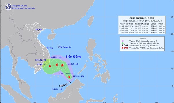 VOVVN - VOV.VN - Theo Trung tâm Khí tượng Thủy văn Quốc gia, vào lúc 13h ngày 22/12, vị trí tâm áp thấp nhiệt đới ở vào khoảng 7,6 độ Vĩ Bắc; 114,9 độ Kinh Đông, trên...