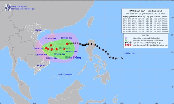 VOVVN - VOV.VN - Vị trí tâm bão số 6 ở vào khoảng 17,4 độ Vĩ Bắc; 114,3 độ Kinh Đông, trên khu vực Bắc Biển Đông, cách quần đảo Hoàng Sa khoảng 230km về phía Đông...
