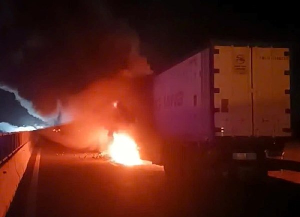VOVVN - VOV.VN - Sáng 9/10, lực lượng chức năng khám nghiệm hiện trường, điều tra làm rõ nguyên nhân vụ cháy xe container trên cao tốc Vĩnh Hảo - Phan Thiết. Xe cứu hộ được điều...