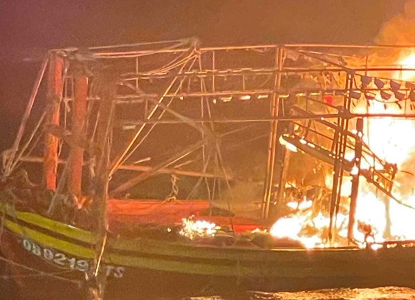 VOVVN - VOV.VN - Tàu cá của ngư dân tỉnh Quảng Bình bốc cháy dữ dội khi đang đánh bắt trên vùng biển cách cửa biển Nhật Lệ, thành phố Đồng Hới khoảng 80 hải lý về...