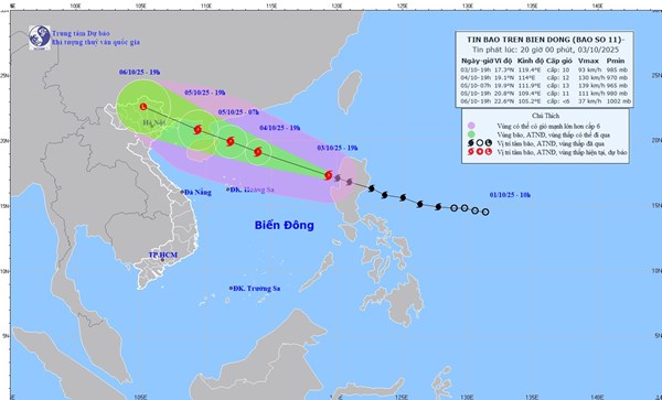 VOVVN - VOV.VN - Theo Trung tâm dự báo Khí tượng Thủy văn quốc gia, hồi 19 giờ, vị trí tâm bão số 11 ở trên vùng biển phía Đông khu vực Bắc Biển Đông. Sức gió...