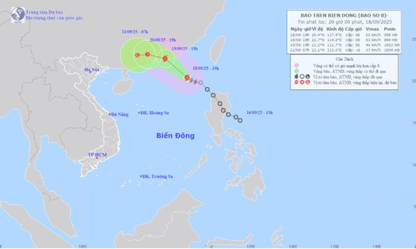 VOVVN - VOV.VN - Theo Trung tâm Dự báo khí tượng thủy văn Quốc gia, hồi 19 giờ ngày 18/9, vị trí tâm bão ở vào khoảng 20,4 độ Vĩ Bắc; 117,4 độ Kinh Đông, trên vùng...