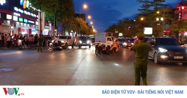 VOVVN - VOV.VN -Quá trình dừng chờ đèn tín hiệu giao thông ở ngã ba Trường Lâm – Ngô Gia Tự, quận Long Biên, Hà Nội, 7 chiếc xe máy đã bị 1 xe ô tô húc...