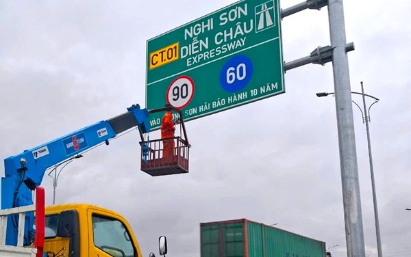 VOVVN - VOV.VN - Nhà thầu Sơn Hải gắn hàng chữ "Vào đường Sơn Hải bảo hành 10 năm” trên biển báo hiệu đường bộ cao tốc Nghi Sơn - Diễn Châu, theo cơ quan chức năng...