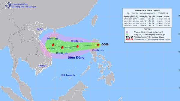 VOVVN - VOV.VN - Hồi 1h ngày 17/9, vị trí tâm áp thấp nhiệt đới ở vào khoảng 17,0 độ Vĩ Bắc; 122,0 độ Kinh Đông, trên đất liền phía Đông đảo Luzon (Philippines).