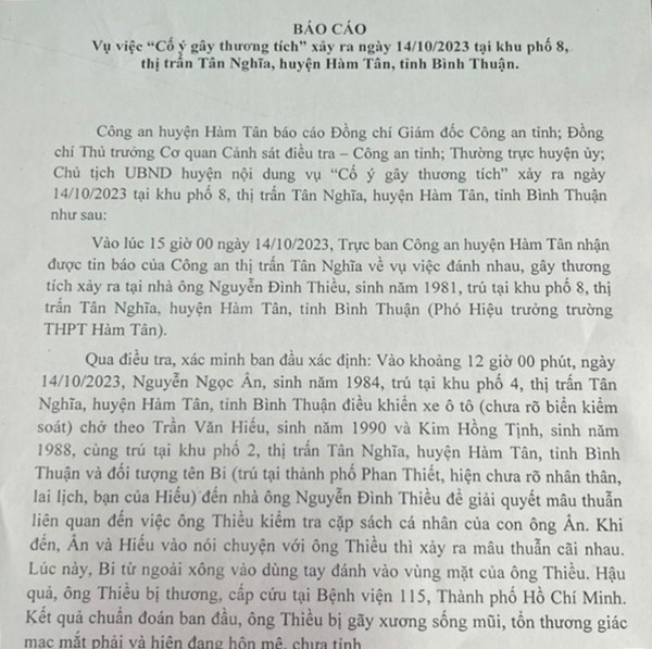 VOVVN - VOV.VN - Chiều tối 16/10, Công an huyện Hàm Tân, tỉnh Bình Thuận vừa có báo cáo vụ việc “Cố ý gây thương tích” liên quan đến Phó Hiệu trưởng Trường THPT Hàm Tân, tỉnh Bình...