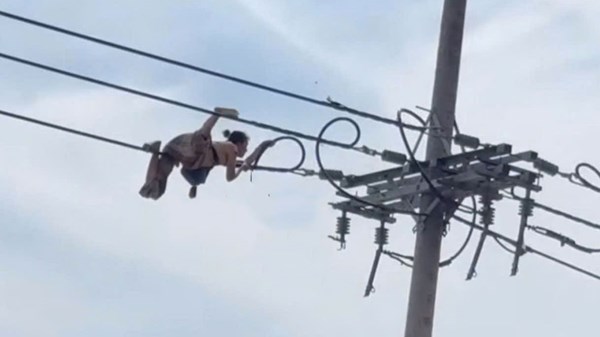Người phụ nữ leo cột, đu dây điện ở TP.HCM