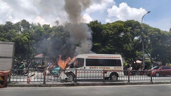 Ô tô 16 chỗ bốc cháy dữ dội giữa trưa tại TP.HCM