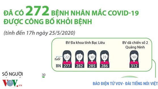 VOVVN - VOV.VN - Ban điều trị - Ban Chỉ đạo Quốc gia phòng, chống dịch Covid-19 cho biết, ngày 25/5, có 5 bệnh nhân mắc Covid-19 được công bố khỏi bệnh.