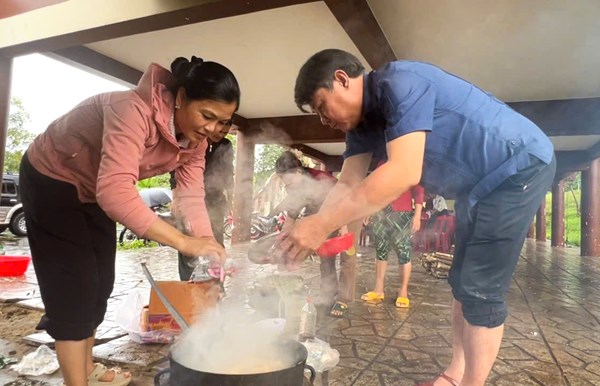 Cán bộ lập bếp dã chiến nấu cơm cho người dân tránh sạt lở đất