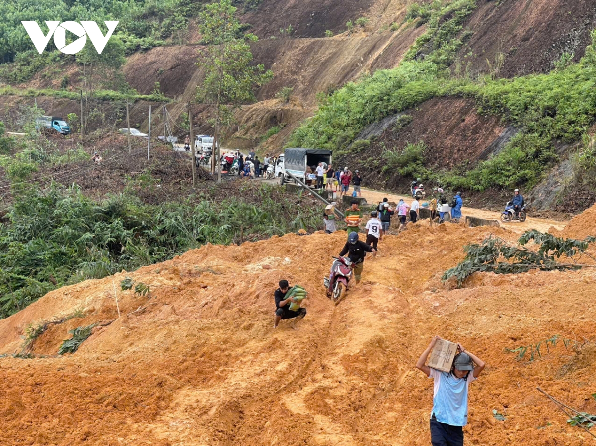 Lực lượng cứu trợ xã Trà Tân vượt 7 km đường rừng trơn trượt, men theo sườn núi, nhiều đoạn sạt lở nguy hiểm để gùi hàng hóa đưa lương thực đến người dân các thôn bị chia cắt nhiều ngày.