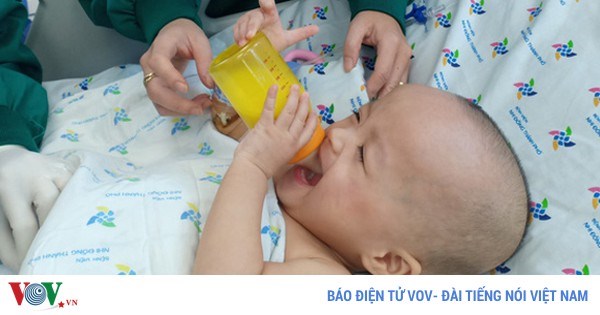 VOVVN - VOV.VN -Trên giường bệnh, Trúc Nhi - Diệu Nhi đã tự tay cầm bình sữa uống, chăm chú nghe những bài hát yêu thích và cười rất tươi khi bố mẹ vào thăm.
